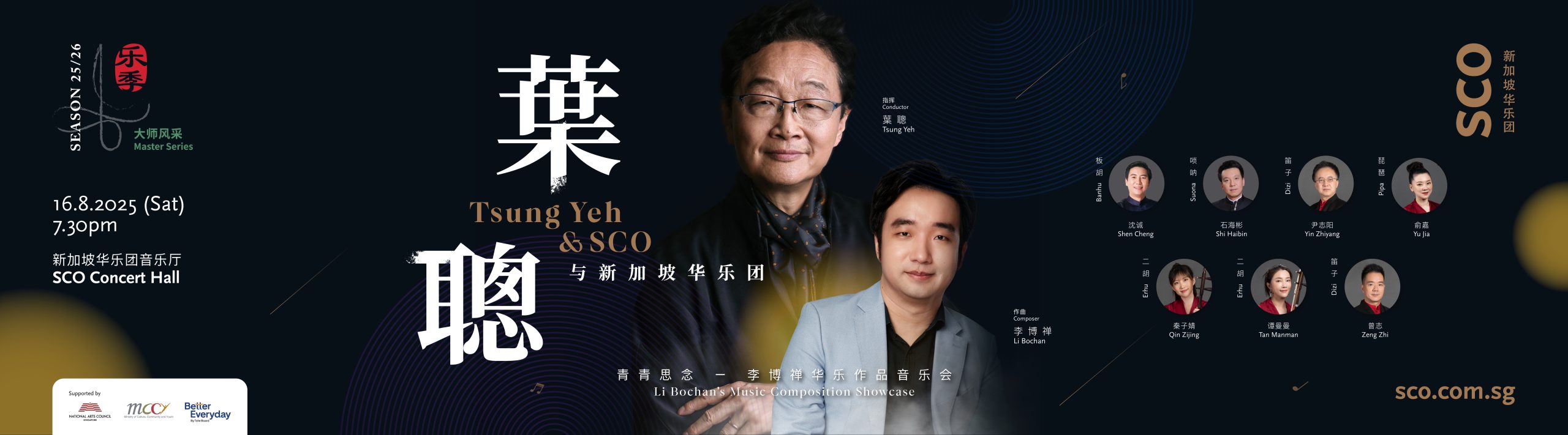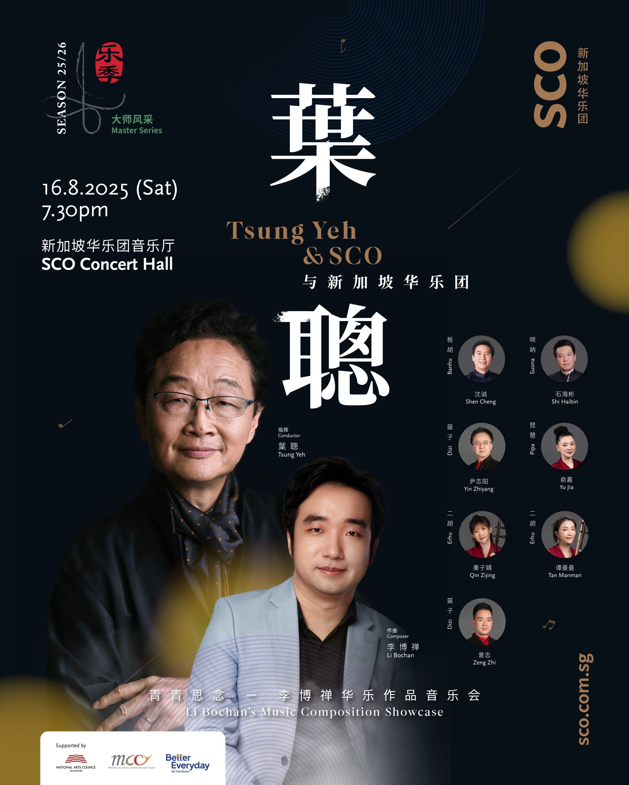 Conductor Emeritus Tsung Yeh teams up with Li Bochan, a stellar composer in the Chinese orchestral music circle, to present this creative and exciting concert! Maestro Tsung Yeh handpicked many of Li Bochan’s recent concerto and ensemble pieces that have taken the Chinese music world by storm. This concert’s star-studded line-up includes esteemed international musicians such as banhu master Shen Cheng, suona virtuoso Shi Haibin and SCO’s musicians.