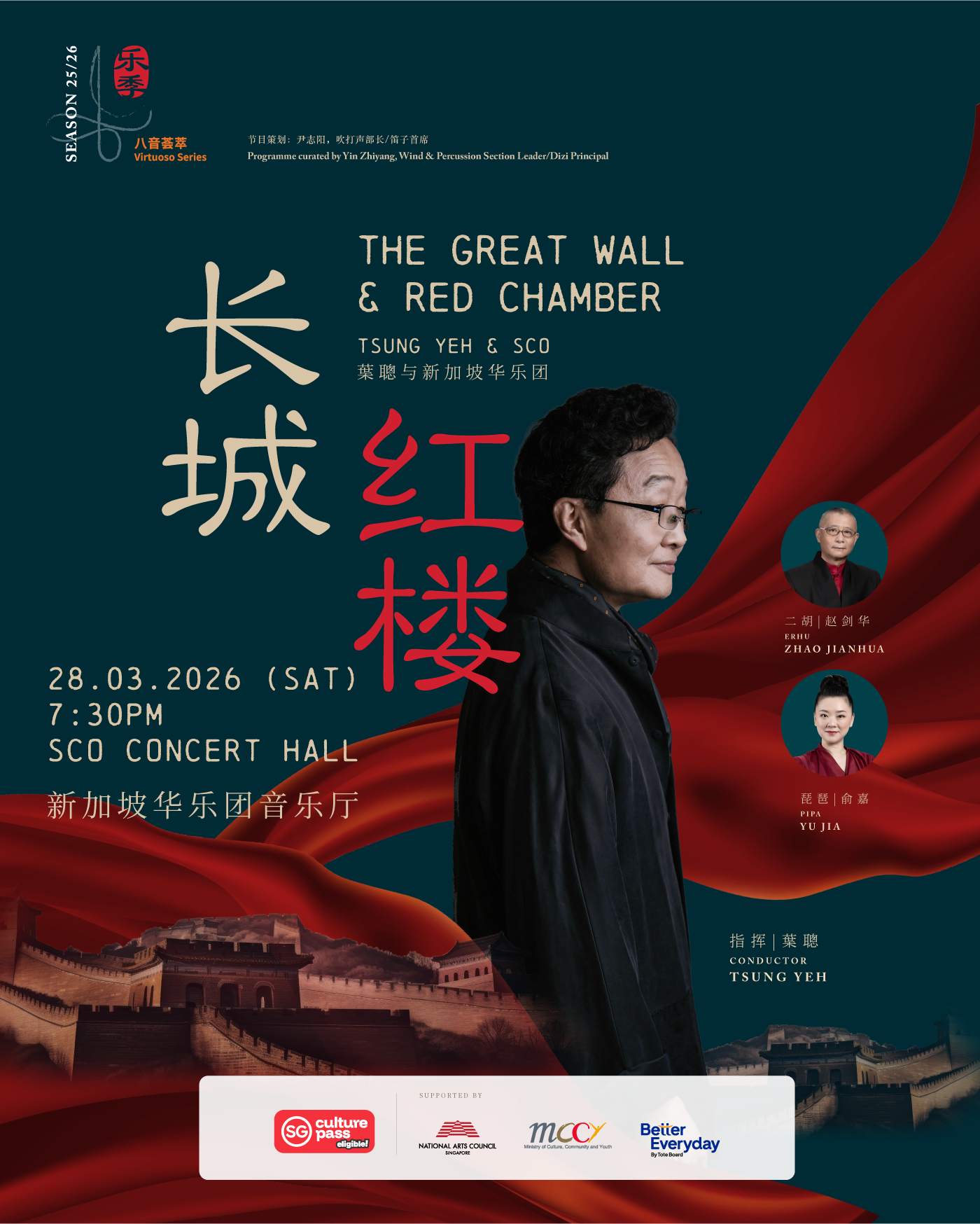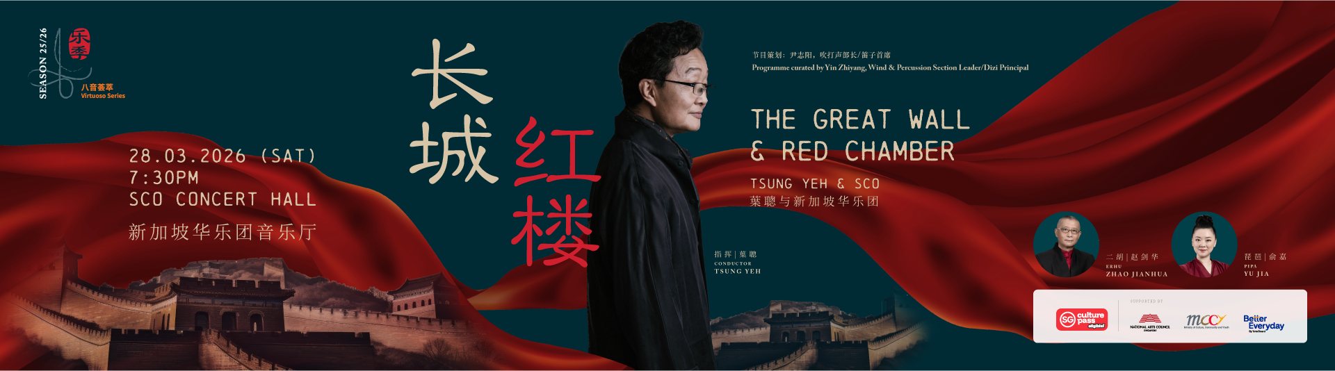 If an array of epic and grand Chinese classics sounds like the perfect evening for you, look no further! Conductor Emeritus Tsung Yeh will lead SCO in a rendition of Dream of the Red Chamber Suite, Harvest, and Guo Feng. SCO Erhu I Principal Zhao Jianhua reprise his virtuosity in the erhu concerto The Great Wall Capriccio, while SCO Pipa Principal Yu Jia narrates sorrow and grandeur in Ambush from All Sides. It is a concert not to be missed by all Chinese music lovers!
