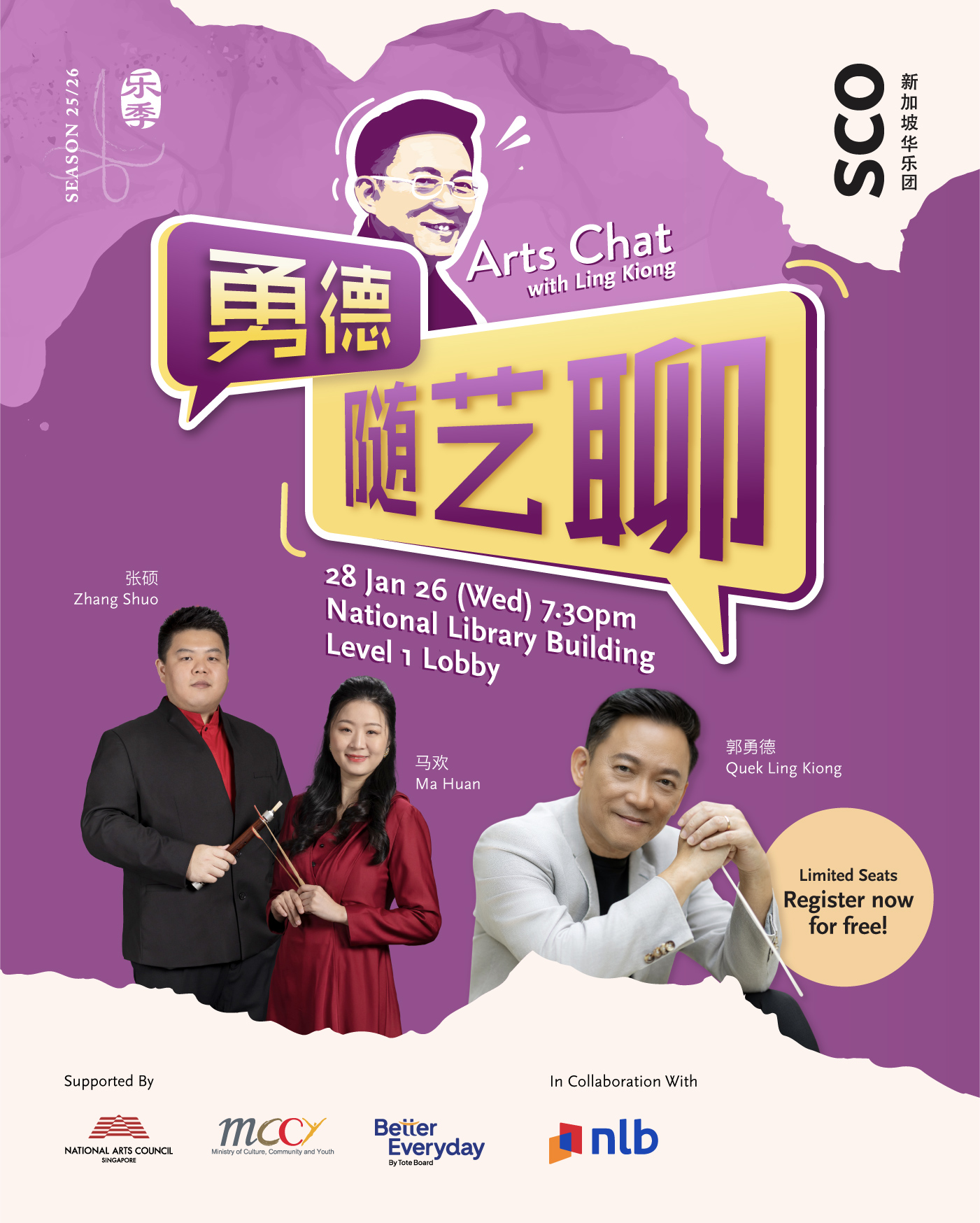 In conjunction with the concert, this pre-concert talk will be hosted by SCO’s Principal Conductor Quek Ling Kiong, who will be joined by yangqin musician Ma Huan and guan musician Zhang Shuo for an engaging conversation. Expect insights into music, inspiration, artistry and behind-the-scenes stories.