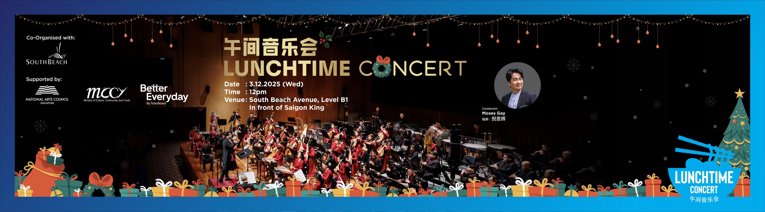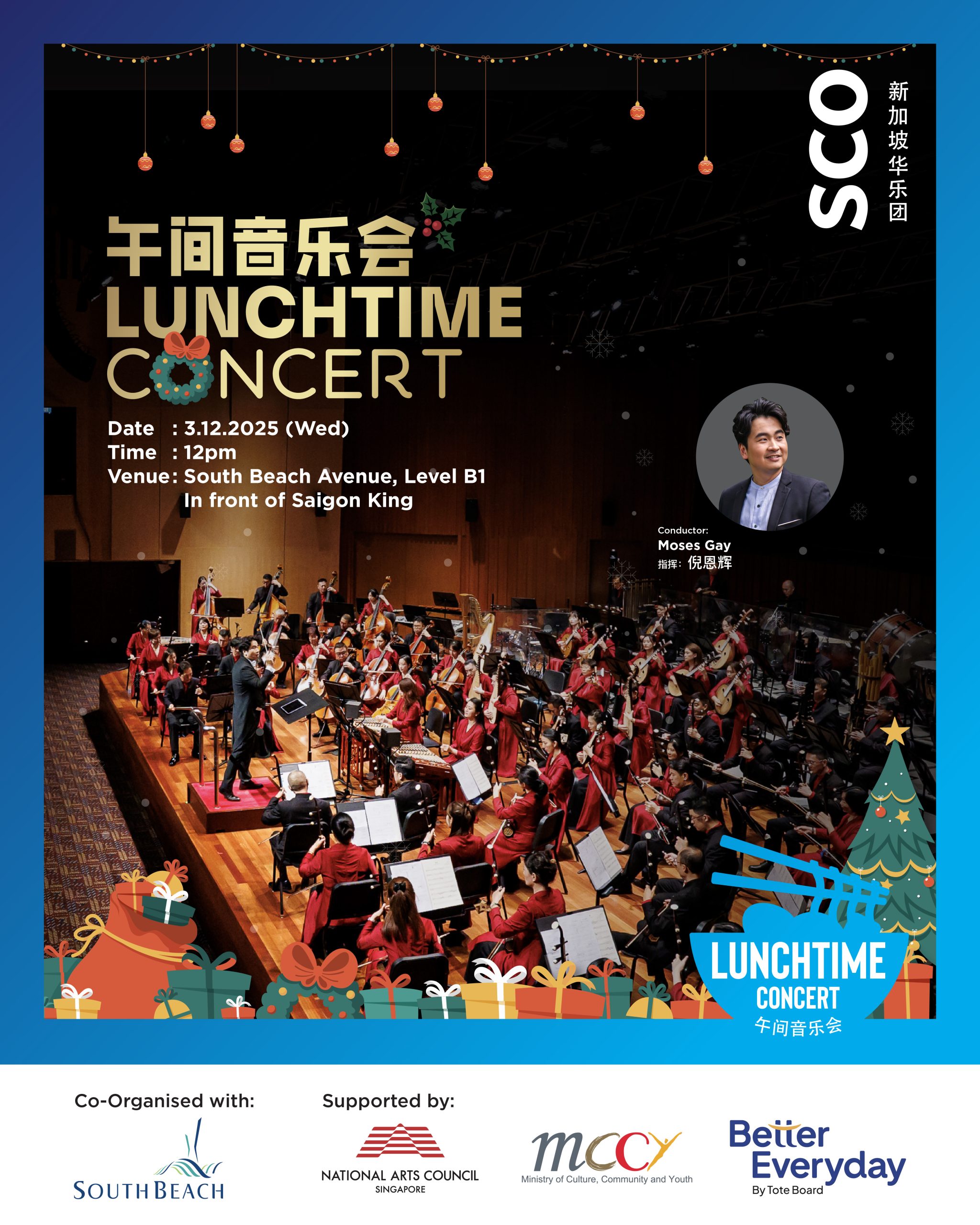 Join the Singapore Chinese Orchestra for a Lunchtime Concert at South Beach Avenue — our very first performance at this vibrant venue! Enjoy Expressions at Qinchuan, by dizi musician Lee Jun Cheng, and The Christmas Song by sheng musician Ong Yi Horng alongside familiar Singapore Folk Songs and the timeless classic Over the Rainbow. Let the music fill your afternoon with warmth and joy, adding a gentle festive sparkle as we end the year on a bright, heartwarming note!