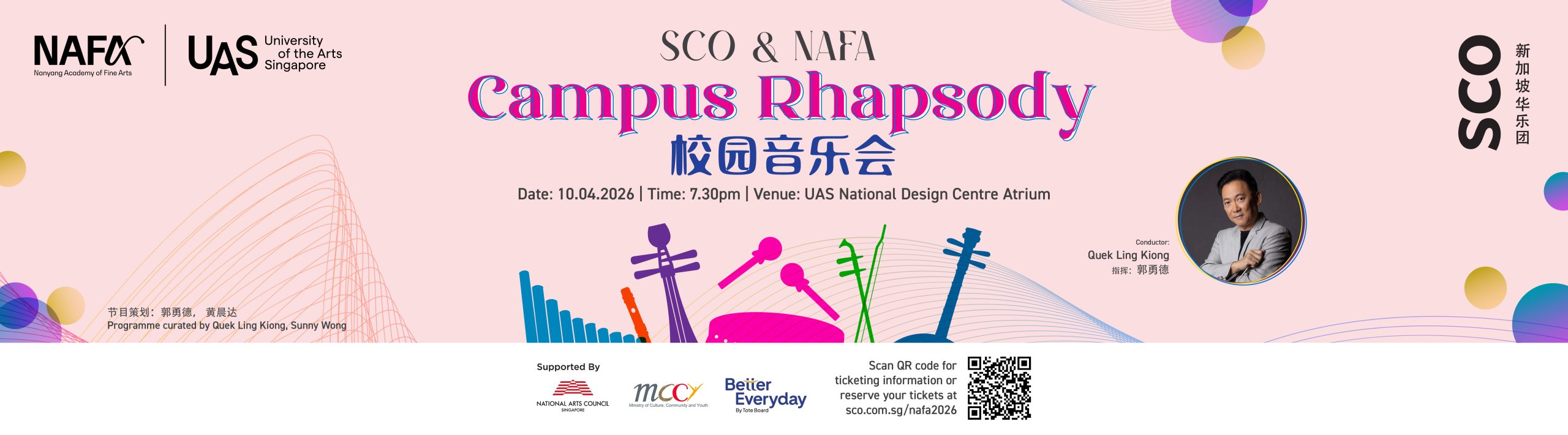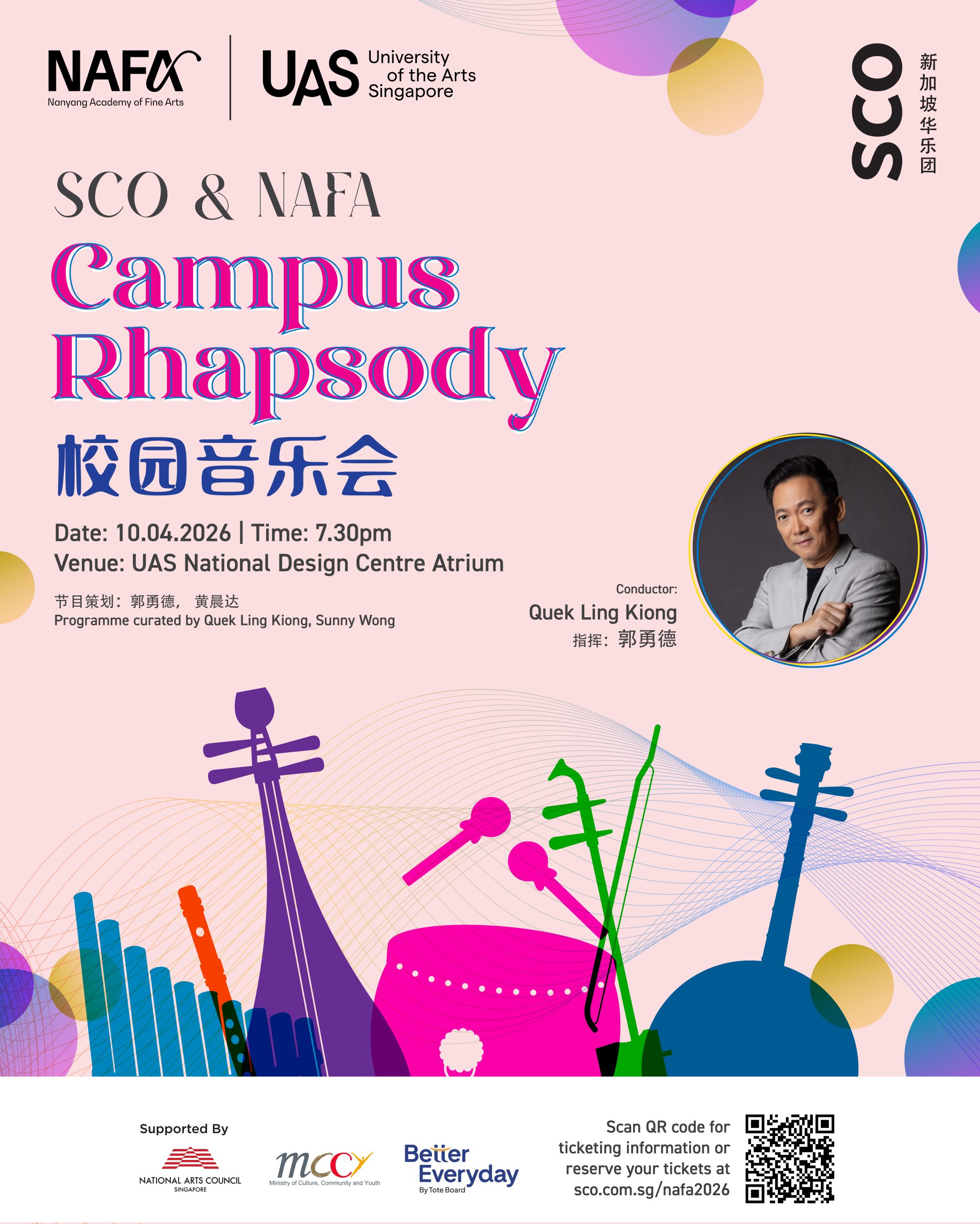今年四月,新加坡华乐团再度携手南洋艺术学院优秀学生,呈献一年一度的 “SCO x NAFA 校园音乐会”。在指挥郭勇德的执棒下,新加坡华乐团将与学生同台献艺,带来《丰年祭》《印象国乐》组曲等多首耳熟能详的精彩曲目。这不仅让学生在实践中成长,还将华乐的悠扬旋律带入校园与周边社区,呈现一场精彩纷呈的华乐盛宴!