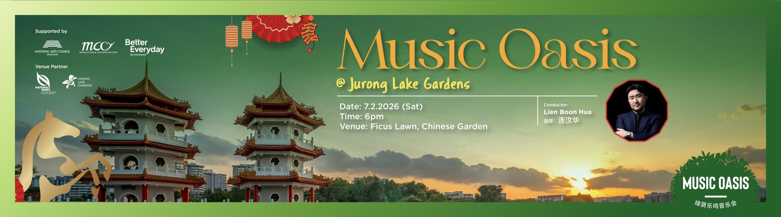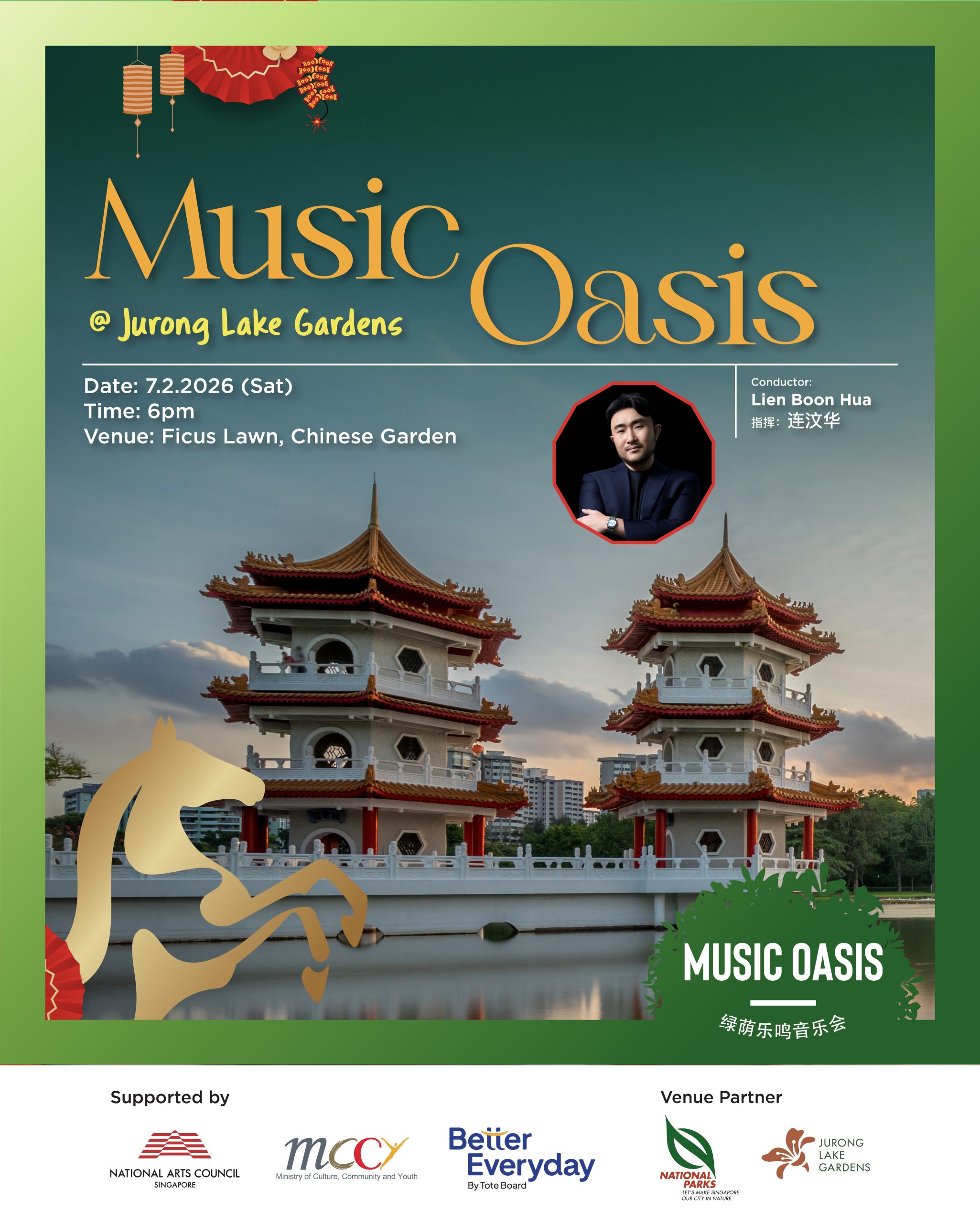 与新加坡华乐团相约裕廊湖滨花园,共庆农历新年!由华乐团副指挥连汶华执棒,绿荫乐鸣音乐会以马年为主题,呈献《马和马车》、由新加坡华乐团笛子演奏家黄显行演奏的《扬鞭催马运粮忙》等充满活力的乐曲。唢呐演奏家黄永和将带来精彩演出,耳熟能详的《999朵玫瑰》更添新春喜气。让我们一同沉浸于花园绿意中,以欢腾旋律迎接团圆与祝福,骏马奔腾,福运连连!